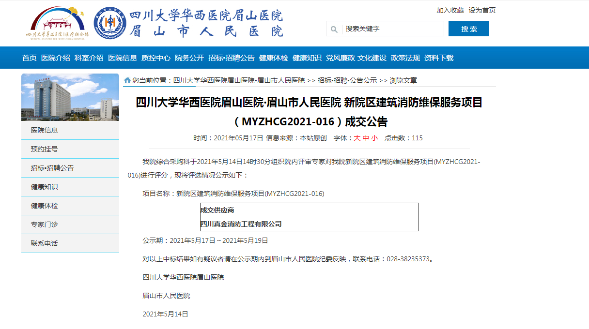 2021年5月7日,眉山市人民医院发布消防维保服务招标公告,于5月14日进行评标工作,通过我公司各项资质、业绩、服务等的展示,眉山市人民医院于5月17日,在单位官网宣布我公司中标。